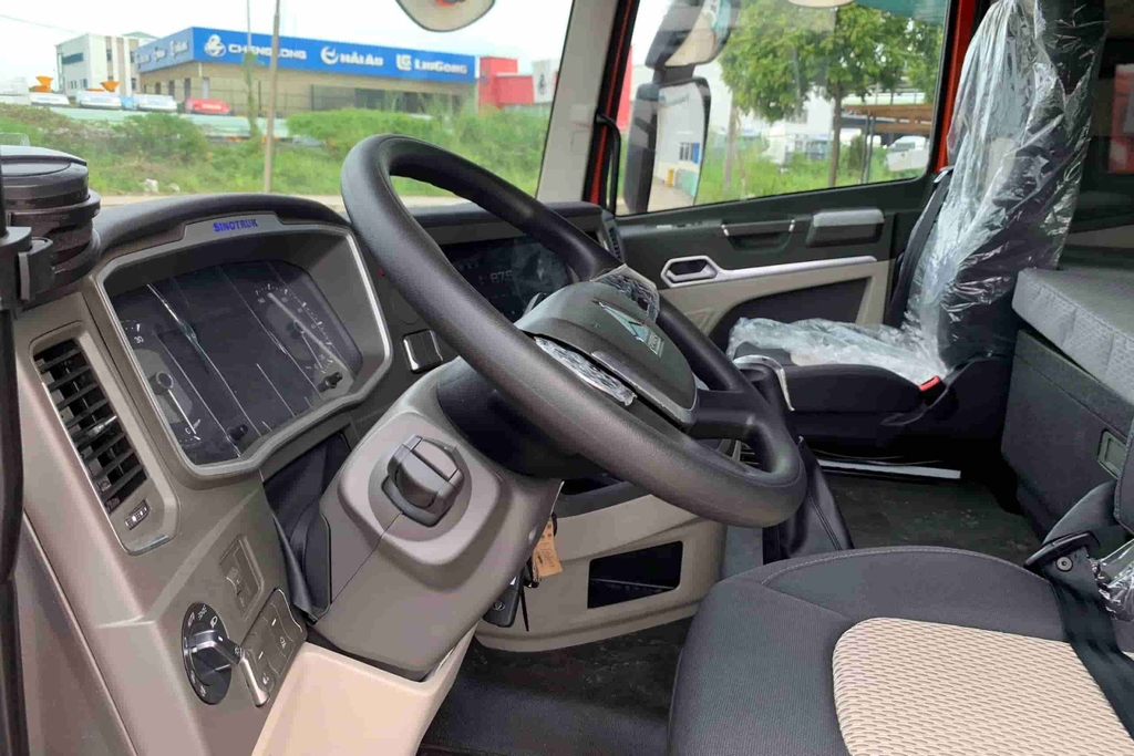 Khoang lái xe đầu kéo Howo Max 460HP được thiết kế như một "ngôi nhà di động" tiện nghi, mang đến trải nghiệm lái xe đỉnh cao với vô lăng 4 chấu chắc chắn, tích hợp các nút điều khiển chức năng, giúp người lái dễ dàng thao tác mà không bị phân tâm. Phía trước là màn hình điện tử hiện đại, hiển thị đầy đủ thông tin vận hành xe, giúp tài xế kiểm soát tình hình một cách trực quan. Tầm nhìn từ khoang lái được tối ưu hóa, đảm bảo quan sát rộng rãi, giảm thiểu điểm mù, tăng cường an toàn khi di chuyển.