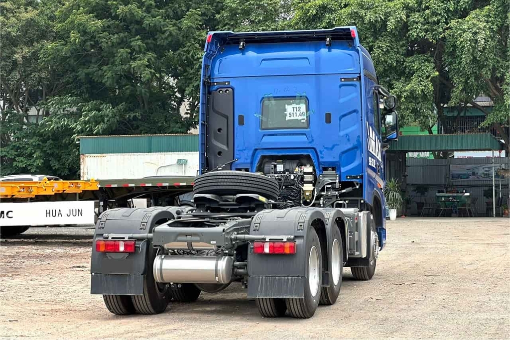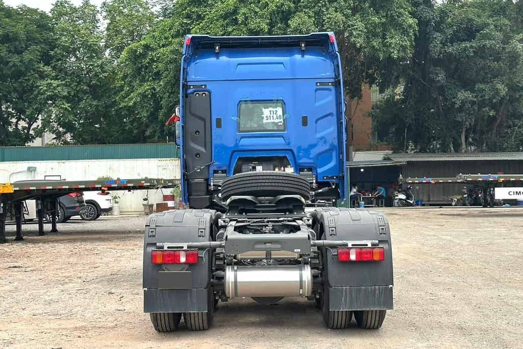 Đuôi xe đầu kéo Howo Max 460 được thiết kế để đảm bảo an toàn và tiện lợi tối đa cho người lái. Điểm nổi bật là hệ thống camera lùi hiện đại, hỗ trợ quan sát toàn diện khi lùi xe hoặc di chuyển trong không gian hẹp. Cụm đèn hậu LED thiết kế nhỏ gọn, tích hợp đầy đủ chức năng (đèn xi nhan, đèn lùi, đèn phanh, đèn cảnh báo), tăng cường khả năng nhận diện trong mọi điều kiện ánh sáng. Bình hơi được bố trí gọn gàng dưới khung xe, không chỉ tránh va chạm mà còn tối ưu hóa không gian, giúp xe vận hành linh hoạt hơn.