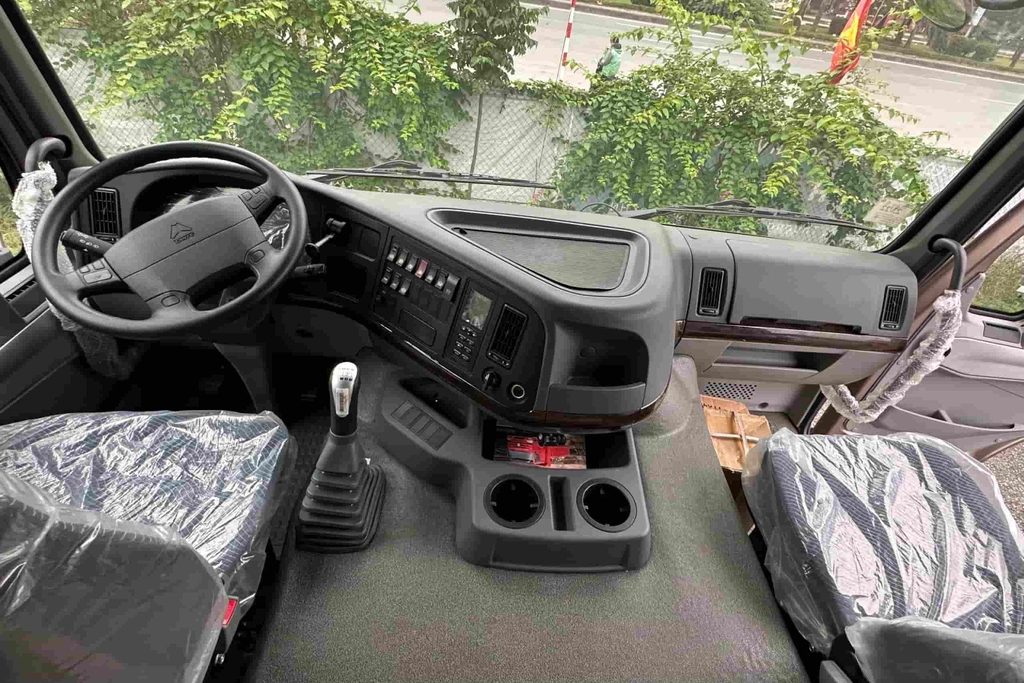 Nội thất xe ben Howo V7G 4 chân thùng vuông được thiết kế hiện đại, sang trọng và đầy đủ tiện nghi, mang đến sự thoải mái tối đa cho người lái. Khoang cabin được trang bị ghế hơi và giường nằm, giúp tài xế thư giãn trong những chuyến đi dài. Các tiện ích như radio và ngăn để đồ rộng rãi được bố trí hợp lý, giúp mọi thứ luôn trong tầm tay. Nhờ vậy, người lái luôn cảm thấy tiện nghi và thoải mái trong suốt hành trình.