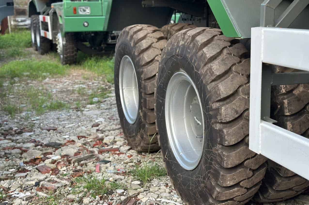 Xe ben Howo đầu lệch sử dụng cỡ lốp 14.00-25 bố vải để hạn chế kẹt đá trong địa hình mỏ. Lốp có kích thước lớn, khả năng chịu tải cao chống mài mòn và bám đường cực tốt trên các loại địa hình xấu như bùn lầy hay dốc trơn trượt.